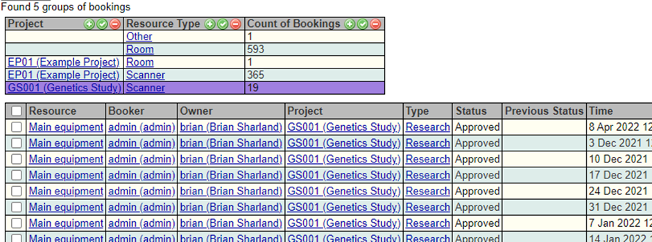 In the example below, bookings have been grouped by Project and then by Resource Type. Selecting a group then displays a List Report of all the bookings in that group. However exporting this report will only export the data shown in the group table.