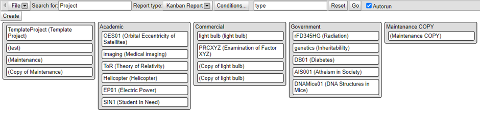 A Kanban report lists instances of a biskit in columns based on a single field. This might be good for a quick overview of projects or resources, but isn't good for large quantities of data.